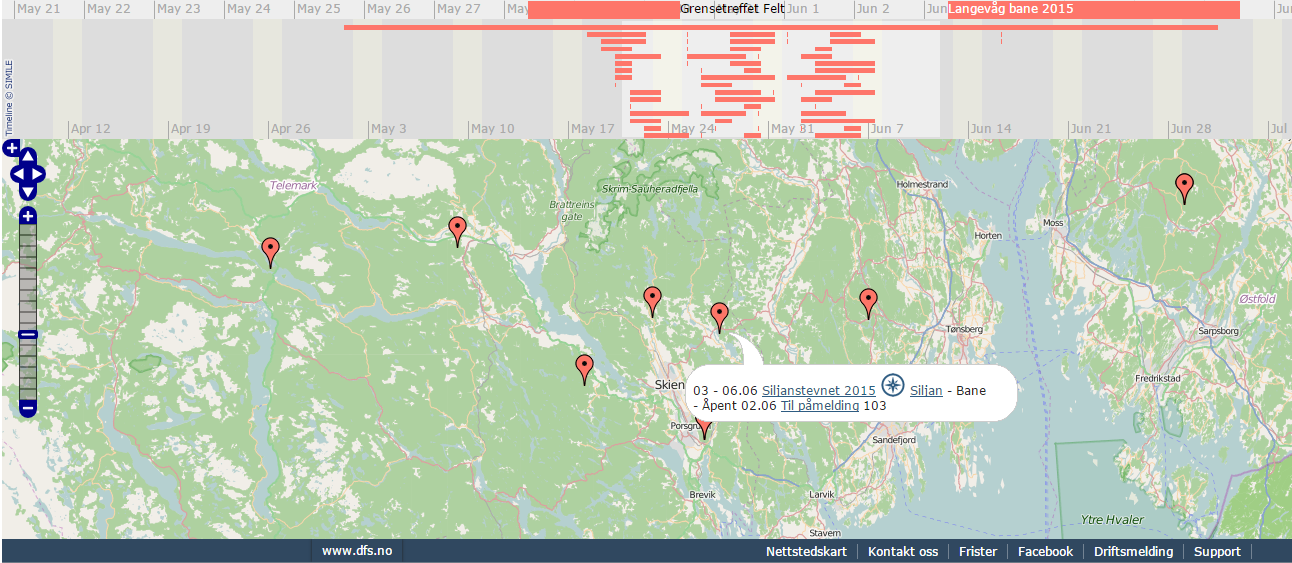 Bruksveiledning: Zoom inn i kartet til det dekker det området du er interesert i å reise til. Deretter trykker du med mus i tidslinjen og drar datoene frammover mens du holder museknappen inne. Når der er et stevne innefor kartutsnittet ditt på aktuelle datoer dukker denne opp på kartet.
