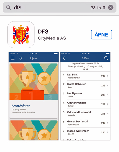 Last opp app via App Store eller Google Play. Søk etter DFS: