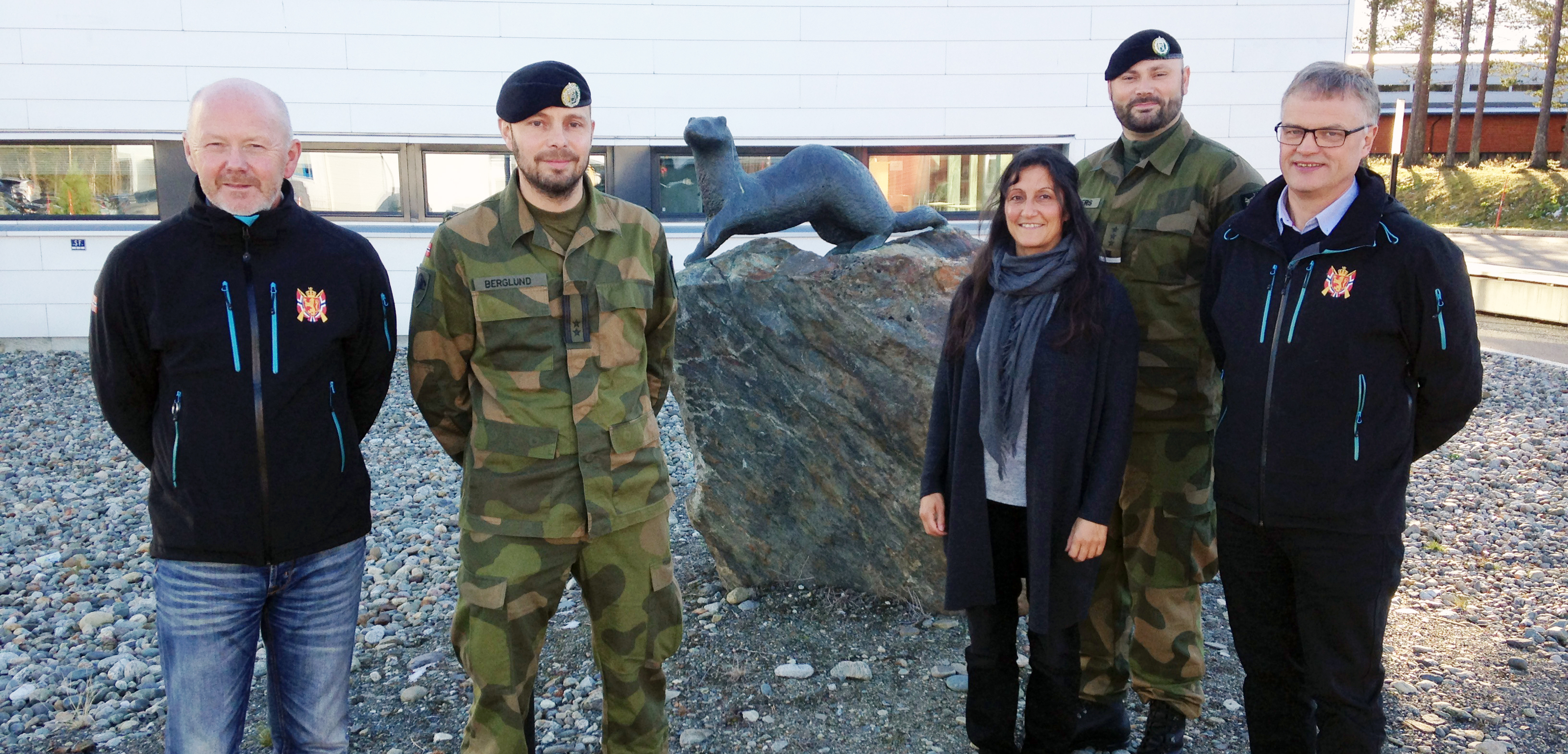 Det frivillige Skyttervesen har knyttet sterkere bånd til Panserbataljonen. Fra venstre: Utdanningssjef DFS Engebret Mjøseng, Pål Berglund, Regina Alexandrova, rittmester Mats Randers og generalsekretær i DFS, Jarle Tvinnereim.