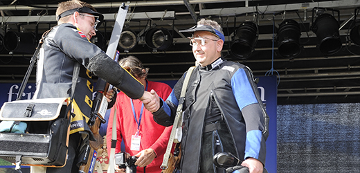 Einar Furuseth gratuleres av Øyvind Solbrekken Flatla - begge endte på 247 poeng.
